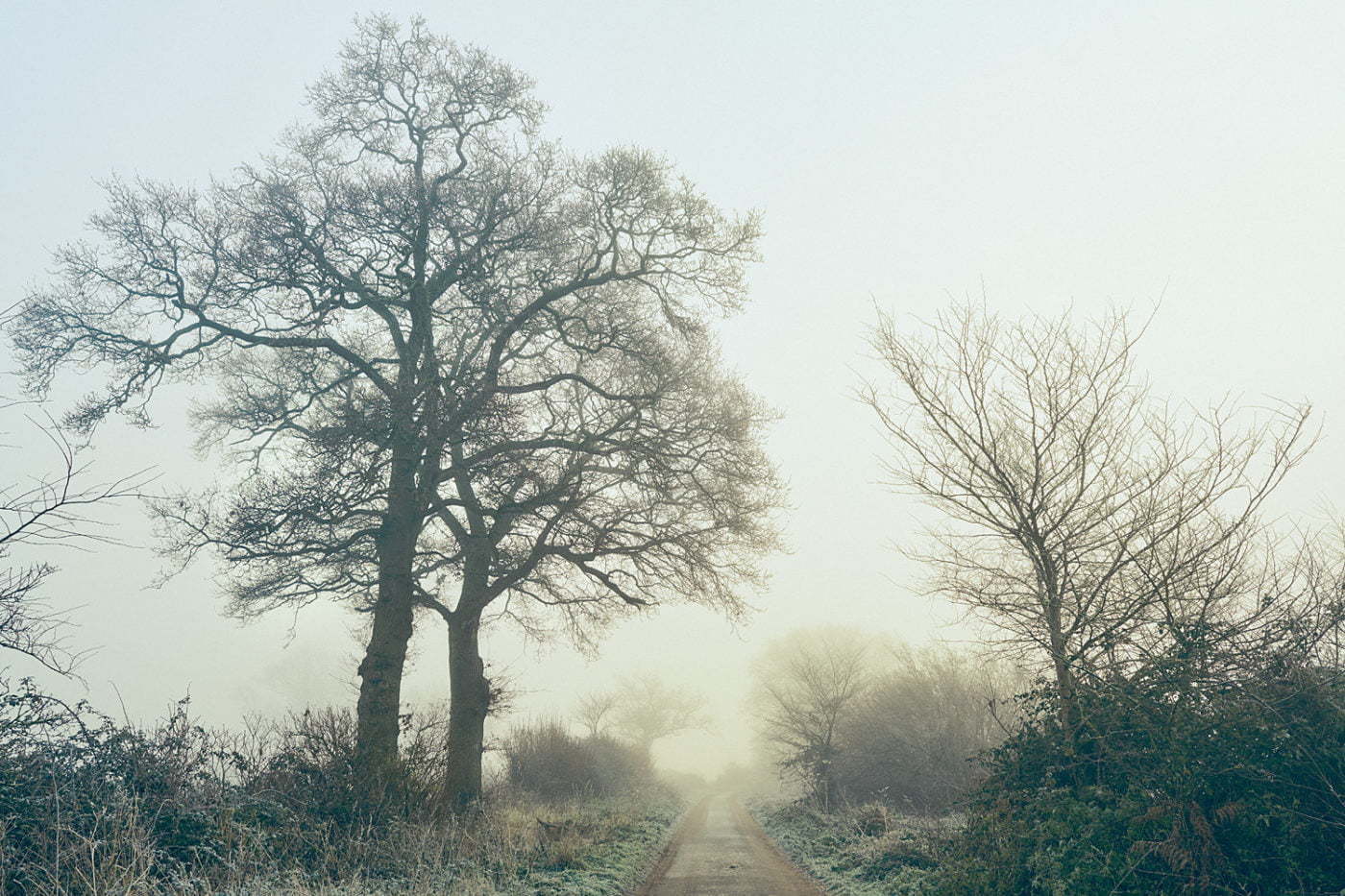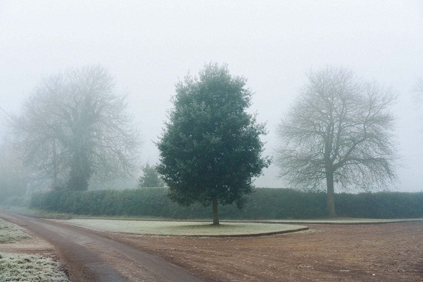 We were spending a few days at a friend’s thatched cottage somewhere in the Norfolk countryside, eating well and drinking plenty as we caught up on each other’s news over the last 2-3 years. I woke up early on our final day, more bleary eyed than hungover this time around and before either of our families were stirring. I decided on the spur of the moment to go off for a wander with my camera gear to see if I could capture a few memories. It wasn’t until I stepped outside the front door that I became aware of the thick fog blanketing my surroundings and felt a little surge of excitement building up at what the elements might bring to the light. I only had to open their gate and step onto the lane for the first shot to jump out at me, an evergreen standing proud on its own manicured lawn. That was some seriously thick fog and it didn’t look like the sun would be breaking through any time soon.