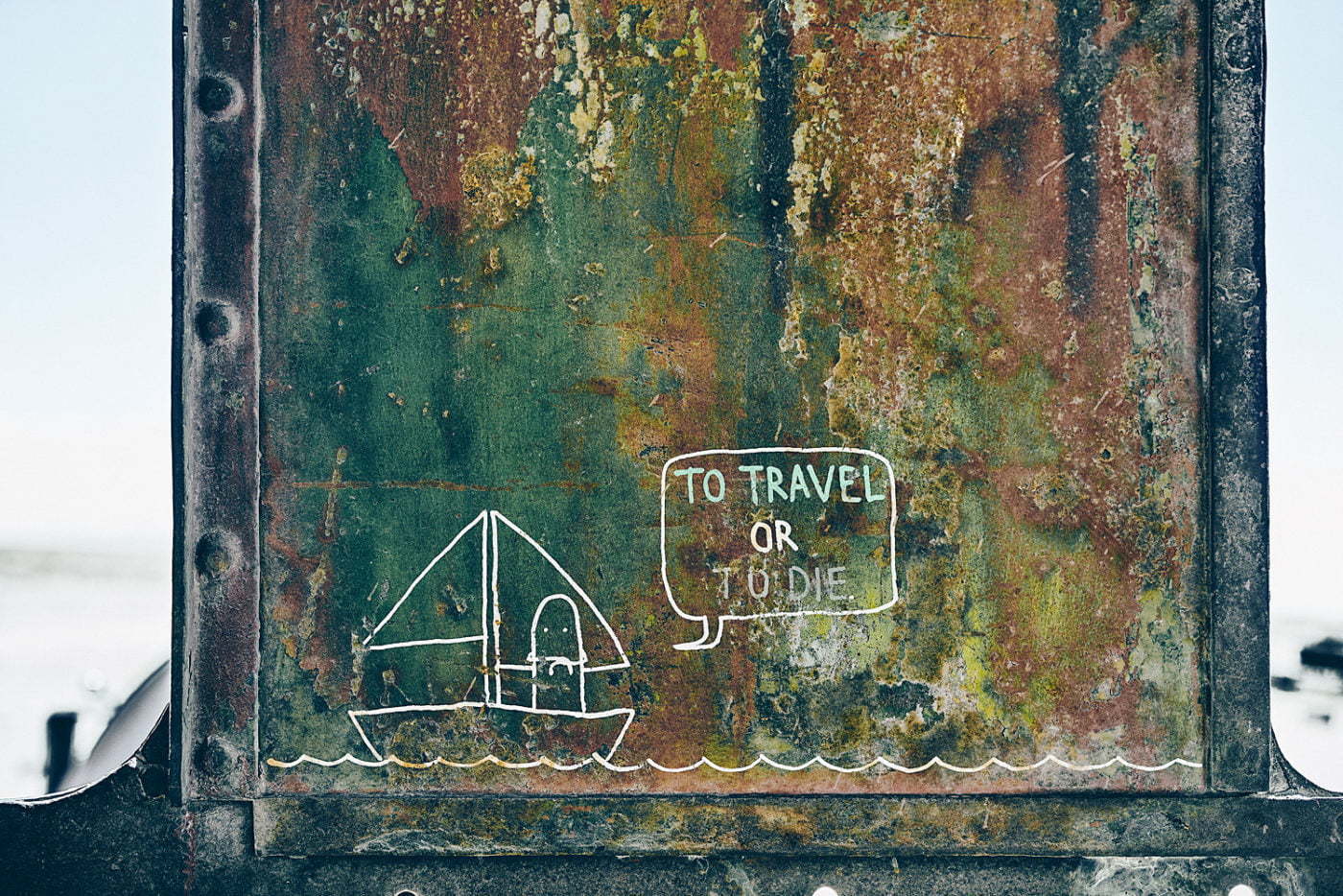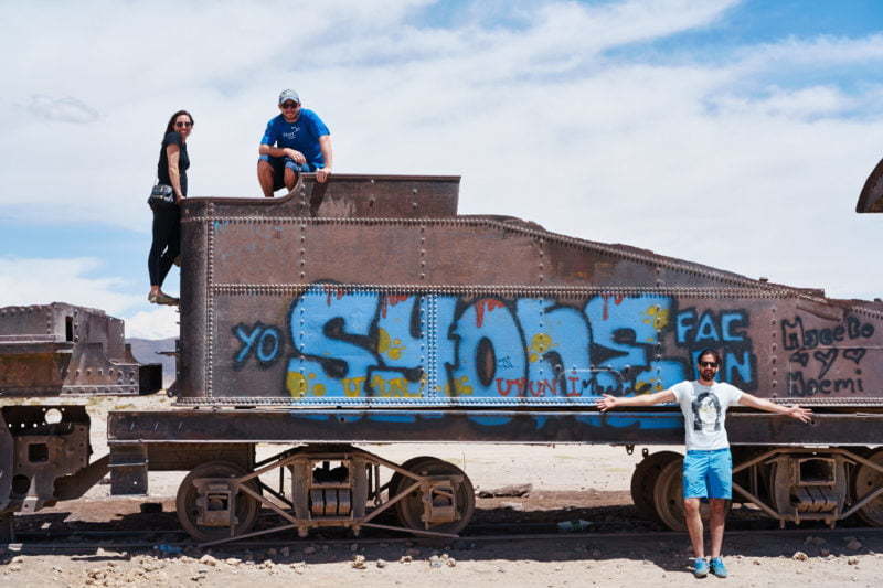 The final day! This was the earliest start, something like 3am if my memory serves me right. We needed to be on the salt flats of the Salar de Uyuni at daybreak and we made it. After we’d got our morning shots (including the much-copied perspective-defying comedy ones), we headed to Cactus Island for our final meal at the tables set up there. A short pit-stop at the Hotel Sal and then we left the salt flats behind. The train cemetery was our final destination before being dropped off at the town of Uyuni. The doodle ‘To Travel or to Die’ was in the engine room of one of the locomotives. A fitting end to our epic journey.