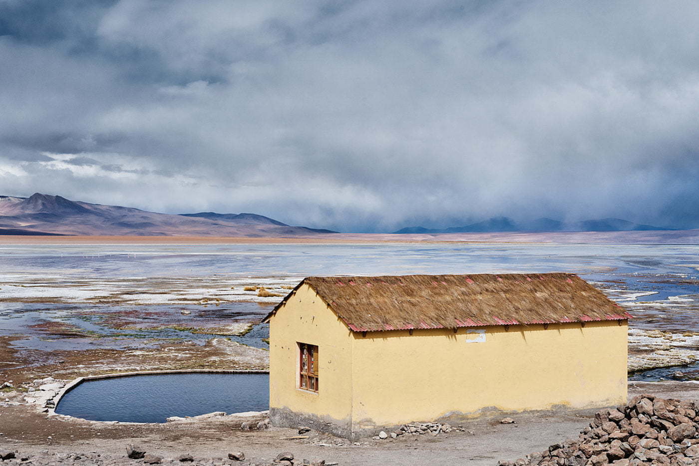 We lunched on the edge of a lake, with one of Bolivia’s many dormant volcanoes dominating the background. When the clouds come in and the wind picks up, you notice the cold very quickly. So we hit the road once more and headed to our next destination, the promised natural thermal baths! Imagine the excitement of jumping into a huge hot tub in the great wide open and the relaxation that comes over you as you survey the world not so slowly changing before your eyes. You really could see the clouds rolling in over the horizon, creating a truly bleak elemental landscape. Yet again, the rain did not reach us. Unfortunately, by the time the sun disappeared behind the clouds, I’d already managed to burn my stomach and thighs. I’d been smart enough to put sunblock on from my shoulders up but that sun is mean in those high altitudes and the water merely refracted the rays back on me below the waterline. Live and learn!